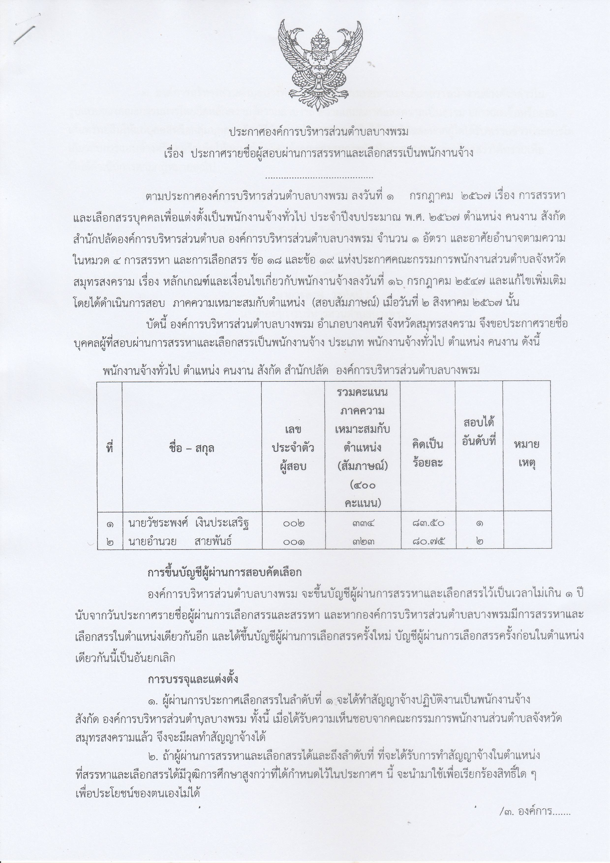 ตำแหน่ง คนงาน สังกัด สำนักปลัด องค์การบริหารส่วนตำบลบางพรม